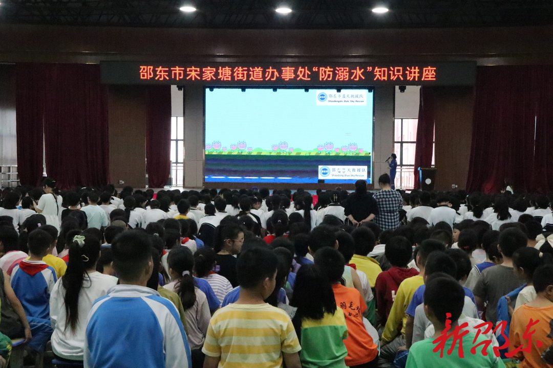 新邵东客户端5月11日讯(记者 曾超众 通讯员 李超 周慧 唐芙容 刘峰)5月10日,邵东市宋家塘街道办事处在城区五中礼堂举办防溺水知识讲座,邀请市蓝天救援队队员为城区五中、宋家塘小学的学生们上了一堂生动的防溺水安全教育课。