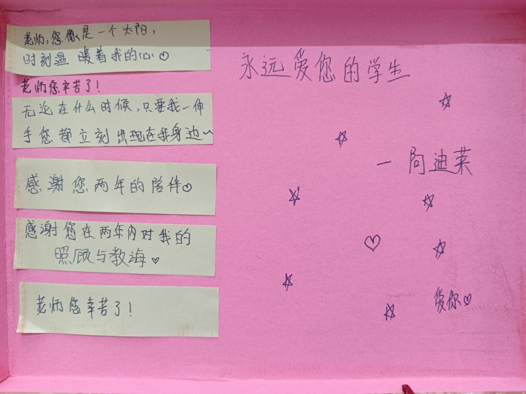 另一个学生阿迪莱·热苏力,中午的时候就跑到办公室说:“老师,您上一次家访和我拍的合影还在这里吗?”申老师把照片递给她,她一蹦一跳地回去了。下午,阿迪莱揣着一个精美的盒子跑来,“申老师,送您一个小礼物,希望您能喜欢!”申老师接过礼物,打开一看,里面装着一个两人合影的艺术相框,盒盖内侧贴着一张张小纸条:“老师,您是一个太阳,时刻温暖着我的心”、“无论在什么时候,只要我一伸手,您都会立刻出现在我身边……”至今,申玢彦老师只要提起这些可爱的孩子们,就感动得泪水盈满眼眶。