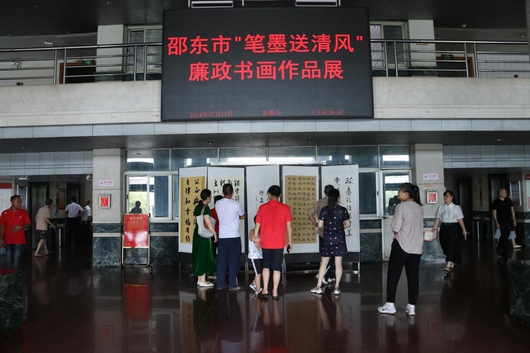 新邵东客户端7月13日讯(记者 刘意忠)翰墨传清韵,廉风送正气。7月12日,邵东市"笔墨送清风"廉政书画作品展在市直机关大楼举办,吸引了广大干部群众参观。