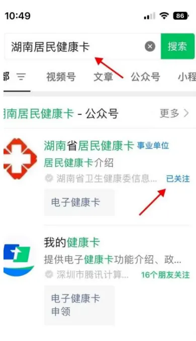 01、微信公众号搜索并关注“湖南省居民电子健康卡”