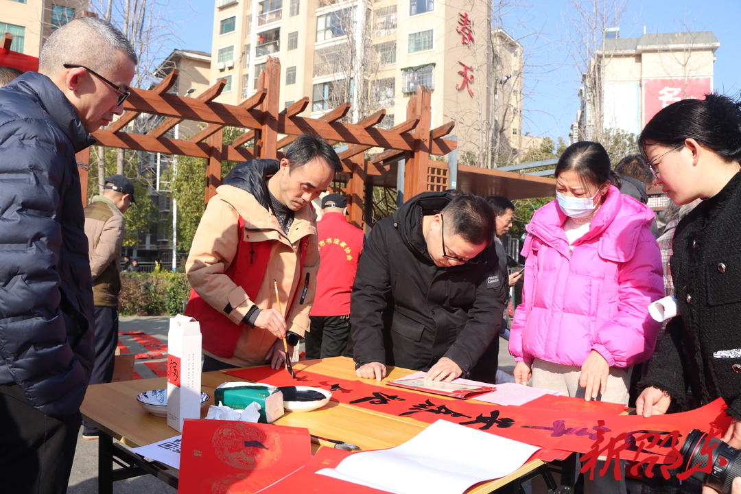 活动现场墨香四溢,书法家们全神贯注,挥毫泼墨,将诚挚美好的祝福融入一副副春联之中。市民们兴致勃勃地围在一旁,满心欢喜地等待着心仪的春联,现场洋溢着欢乐祥和的喜庆氛围。