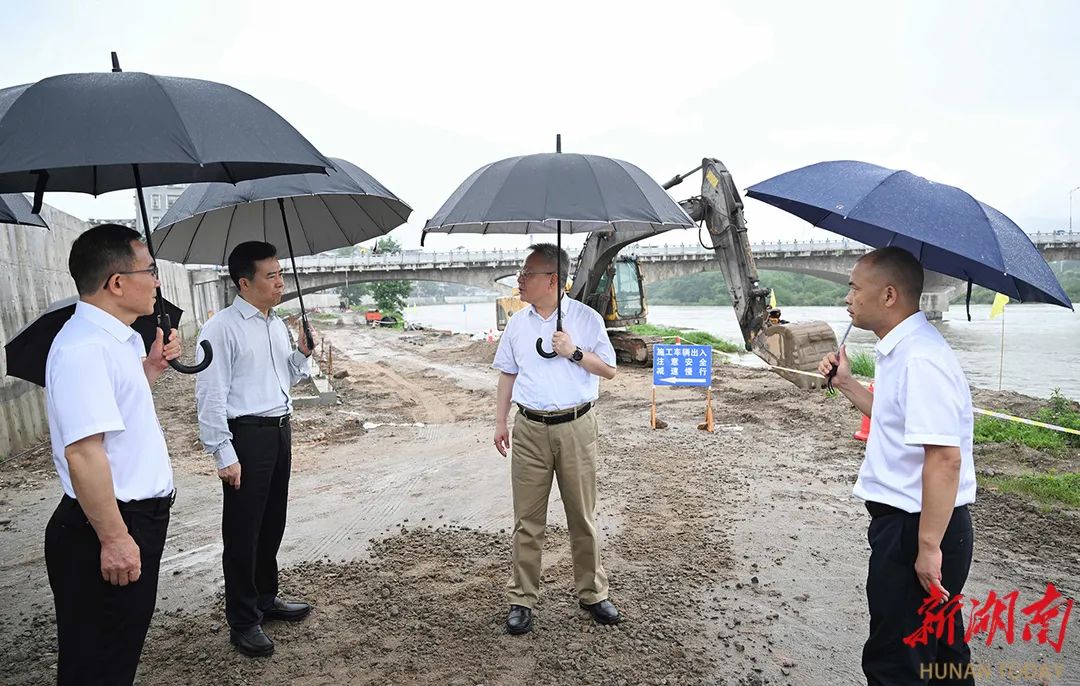 (6月23日,沈晓明来到夫夷水新宁县城段防洪工程项目现场了解建设进展情况。)
