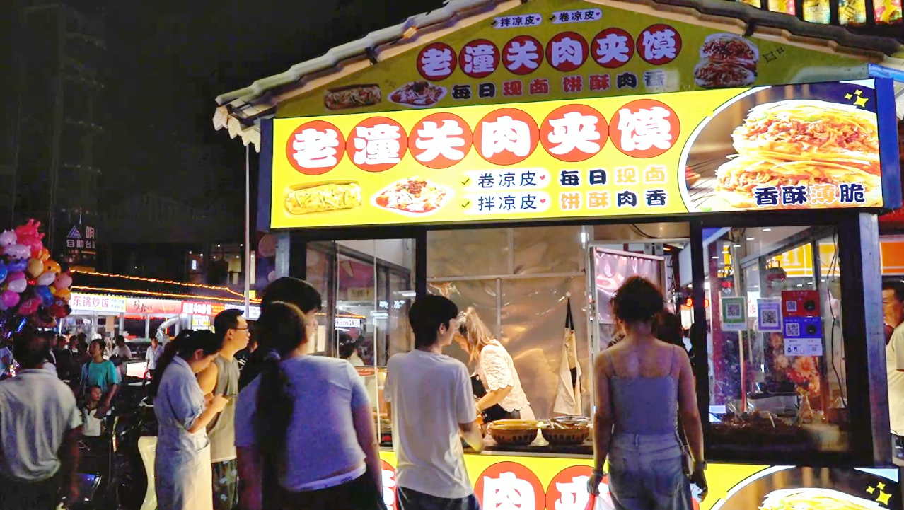 记者走进大汉国潮人文夜市,霓虹璀璨,人声鼎沸,50余个摊位沿街排开,滋滋作响的烤肉、香气扑鼻的铁板鱿鱼、酥脆多汁的老潼关肉夹馍……琳琅满目的特色美食吸引众多食客驻足。市民们携家带友穿梭其间,手中捧着美食,耳边传来主题舞台区的演出声与创意舞台区的互动声,在袅袅香气与欢声笑语中,尽享夏夜的休闲与惬意。