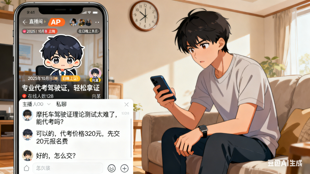 2025年10月8日晚,向某在某视频APP内刷到可帮忙代考驾驶证的直播间,向某正需考一个摩托车驾驶证,但理论测试难以通过,便私聊“主播”了解情况,知晓代考摩托车驾驶证价格为320元,报名费为20元后,向某立即缴纳了20元报名费,并按对方要求下载了能开启屏幕共享功能的APP并配合提交各类资料。