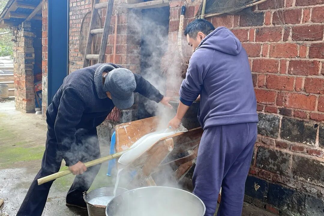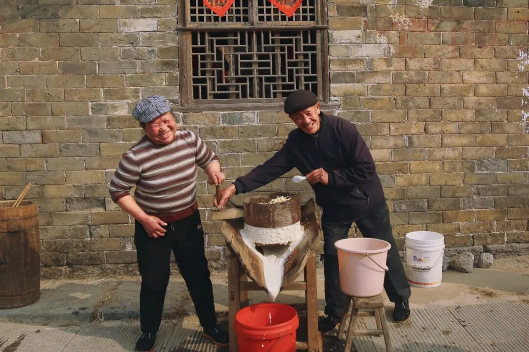 老人们围在石磨旁,推磨磨浆,雪白的豆浆顺着磨盘缓缓流出,经过煮浆、点卤、压制,化作一板白嫩的豆腐,豆香弥漫在呼吸之间。