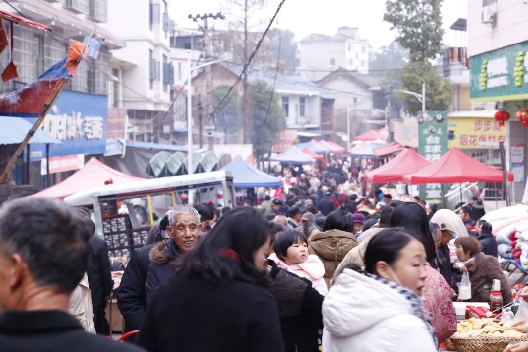肉摊前,师傅手起刀落,新鲜猪肉被精准分割;竹篮里,糖果、干果、新鲜蔬果、新春饰品一应俱全,吆喝声、讨价声、说笑声交织在一起,满是人间烟火与新春喜气。