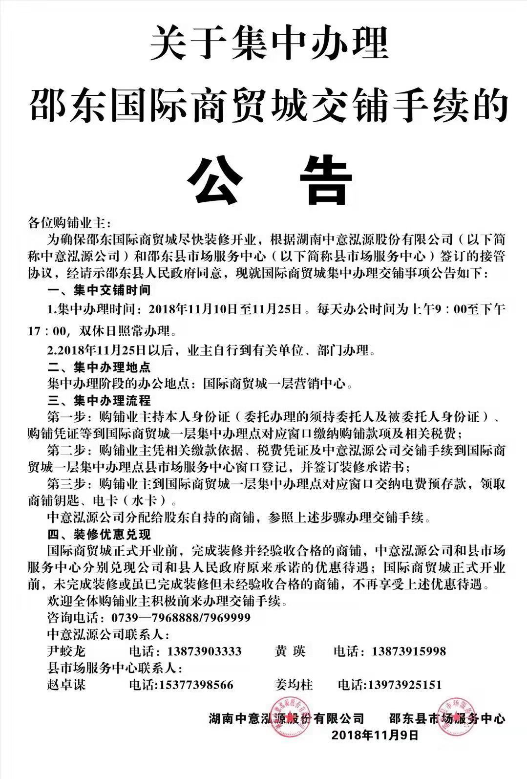 为确保邵东国际商贸城尽快装修开业,根据湖南中意泓源股份有限公司(以下简称中意泓源公司)和邵东县市场服务中心(以下简称县市场服务中心)签订的接管协议,经请示邵东县人民政府同意,现就国际商贸城集中办理交铺事项公告如下: