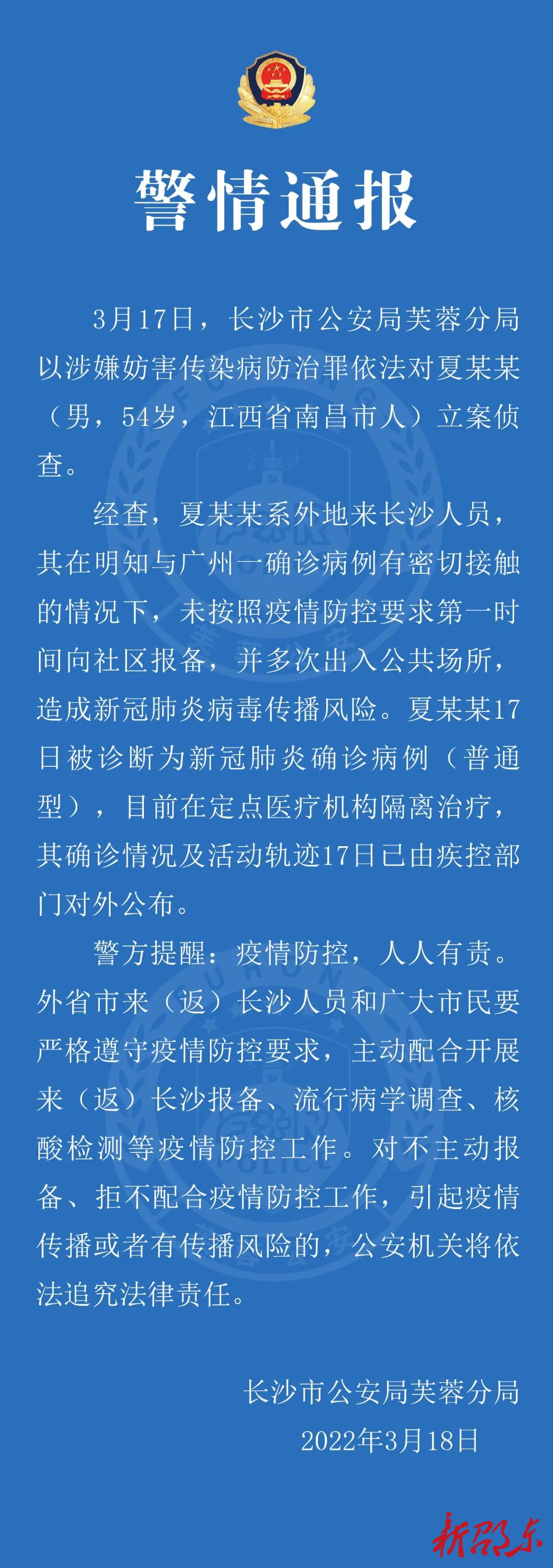 记者刚刚从长沙市公安局获得消息,3月17日,长沙市公安局芙蓉分局以涉嫌妨害传染病防治罪依法对夏某某(男,54岁,江西省南昌市人)立案侦查。