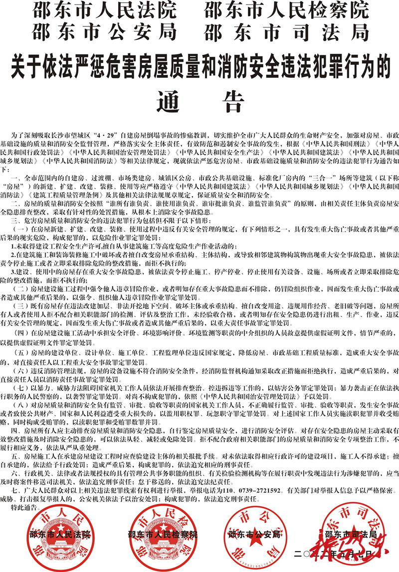 关于依法严惩危害房屋质量和消防安全违法犯罪行为的通告