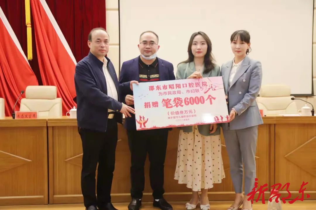 邵东市昭阳口腔医院为市民政局、市妇联捐赠了价值3万元的笔袋,用于留守儿童防溺水宣传。