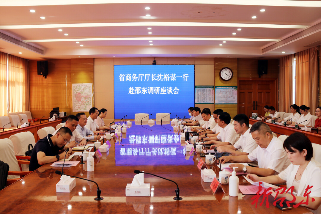 新邵东客户端8月3日讯(记者 张平华)8月2日,省商务厅党组书记、厅长沈裕谋来邵东市调研商务和开放型经济工作。邵阳市委常委、常务副市长王永红,邵阳市副市长刘亚亮,邵东市委书记周玉凡,邵东市委副书记、市长李国军等参加调研或出席座谈会。