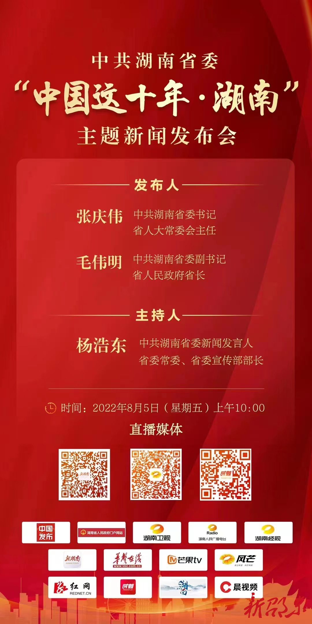 湖南日报8月3日讯(全媒体记者 邓晶琎)“中国这十年·湖南”主题新闻发布会将于2022年8月5日10时在长沙举行。中共湖南省委书记、省人大常委会主任张庆伟,中共湖南省委副书记、省长毛伟明出席,介绍有关情况并答记者问。中共湖南省委新闻发言人,省委常委、省委宣传部部长杨浩东主持。