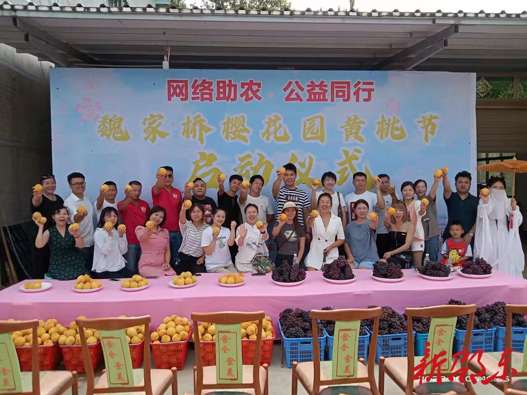 新邵东客户端8月4日讯(通讯员 禹海君)以桃为媒,相聚官桥。邵东市魏家桥镇樱花园内500余亩黄桃喜迎丰收,正式进入采摘期。为了助力农户增收,推进乡村振兴,8月4日,由邵东市委网信办、市农业农村局、市乡村振兴局指导,魏家桥镇党委、政府主办,市新媒体协会协办的“网络助农 公益同行”魏家桥樱花园黄桃节正式启动,活动吸引近30名网络达人以及大量游客参加。