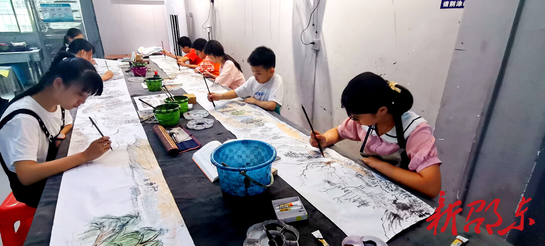 新邵东客户端8月5日讯(记者 刘意忠)为迎接党的二十大胜利召开,邵东市姚佩书画培训中心组织国画班的10名小朋友,一起合作共绘10米山水长卷《古意潇湘》。