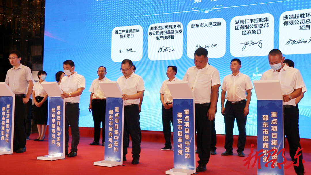 邵东市委常委、常务副市长陈业华介绍了签约的8个项目情况,并和京东云计算有限公司、湖南贝思科技等四家企业负责人现场签约。邵东经开区党工委副书记、主任杨振明,邵东经开区城北管理办书记、主任王卫兵和中铁华源(成都)供应链管理有限公司、上海纽恩特实业股份有限公司等四家企业负责人现场签约。