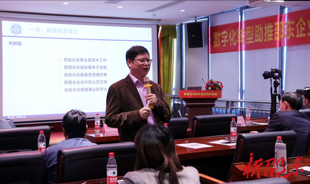 新邵东客户端10月12日讯(记者 曾超众)10月11日上午,邵东市举办数智化与邵东企业创新发展知识讲座,邀请中南大学商学院副院长李大元以“数字化转型助推邵东企业高质量发展”为主题,为全市60余家企业的负责人进行专题辅导。市政协副主席、市工商联主席赵俊洋出席讲座并作了讲话。