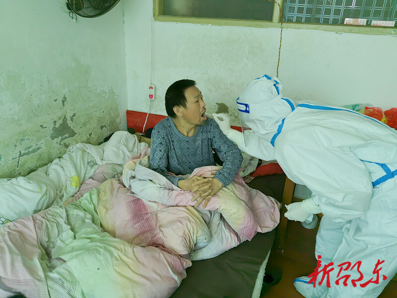 新邵东客户端10月29日讯(记者 张平华)10月29日上午10时,在邵东市大禾塘街道荷田社区,邵东金融系统应急支援队的志愿者正在上门为行动不便的的老人核酸采样。
