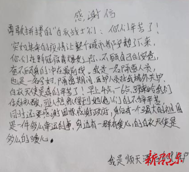 11月5日上午,邵东市妇幼保健计划生育服务中心驻邵东顺天酒店隔离点工作人员收到了一封来自隔离人员佘女士的感谢信。信中,表达了佘女士对隔离点工作人员的感激之情。短短的一封信,让隔离点的工作人员都感动地潸然泪下,觉得所有辛苦、劳累都是有价值,所有的付出都是有温度的。
