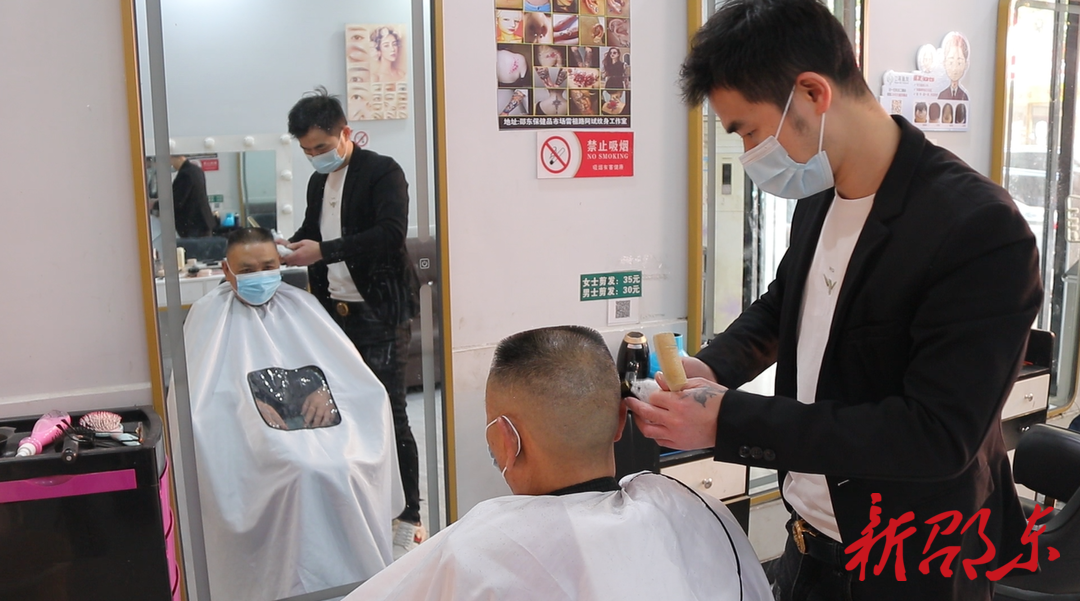 理发店内,理发师正忙着为顾客理发