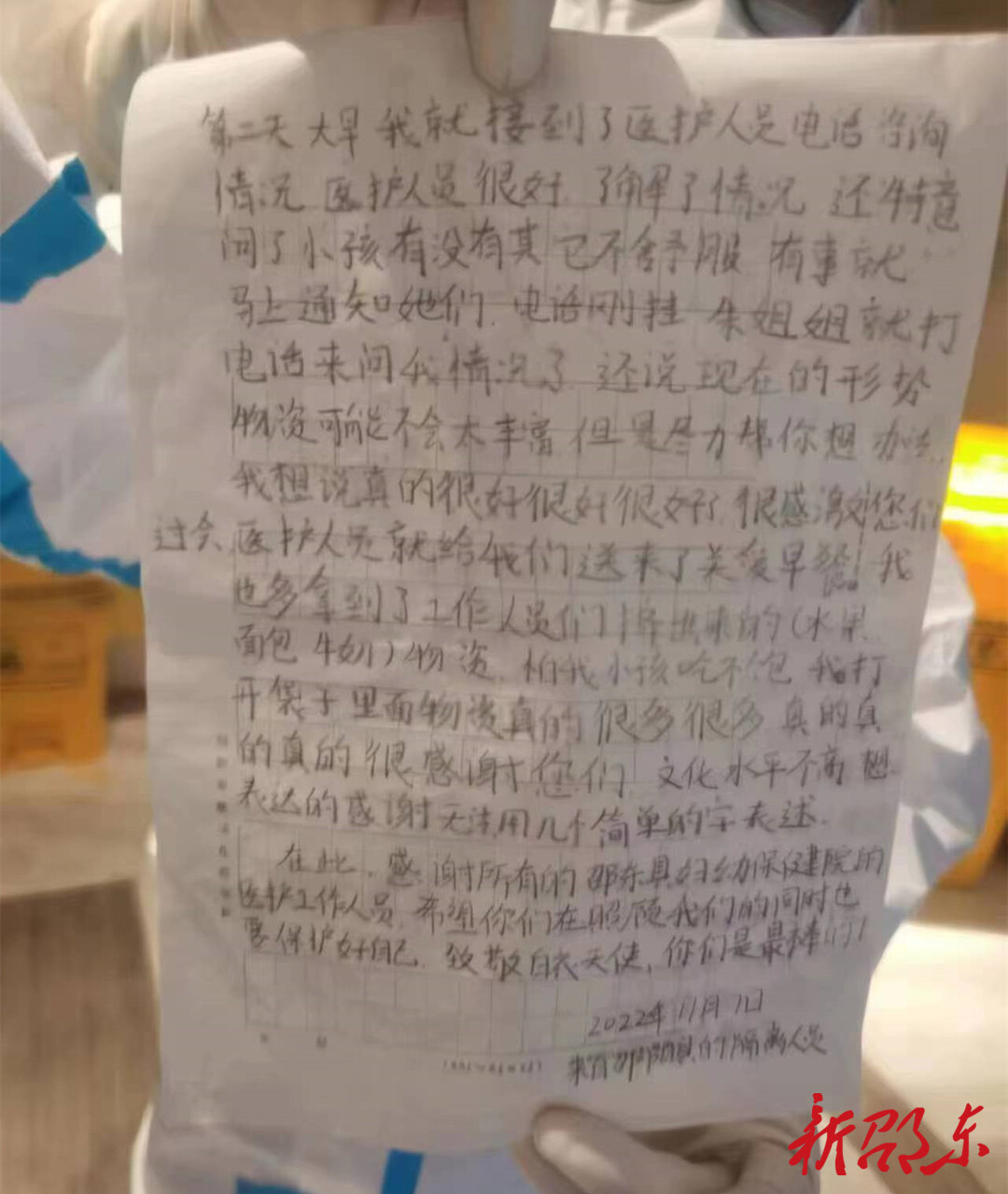 新邵东客户端11月8日讯(记者 曾超众)11月7日中午,邵东市三间房酒店集中隔离观察点的医务人员收到一封隔离人员的感谢信。信中,语言虽然朴实无华,却流露出了真情和对隔离观察点工作人员的感激。
