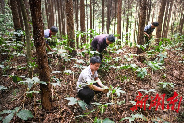 (9月6日,桂东县沙田镇大水村龙家中药材合作社,致富带头人罗敏宝(前)与村民一起给七叶一枝花除草。湖南日报记者 傅聪 摄)