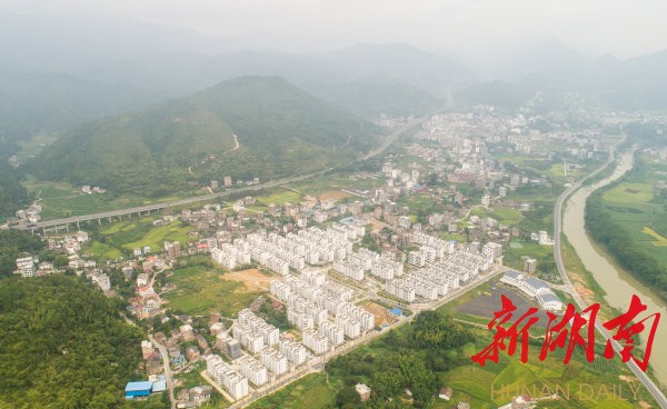 (9月7日,俯瞰桂东县沙田镇大水村异地扶贫搬迁安置点。该安置点配备了幼儿园、村级服务中心等公共服务设施,道路、电力、绿化等基础设施完备。湖南日报记者 傅聪 摄)