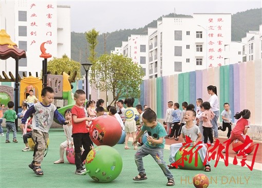(9月7日,桂东县沙田镇大水村易地扶贫搬迁安置点,小朋友在幼儿园内玩耍。该幼儿园位于安置点内,可容纳240名小朋友就读。 湖南日报记者 傅聪 摄)