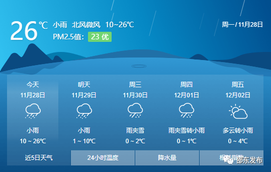 2、11月28日夜间至12月2日全市范围有一轮强寒潮过程,气温骤降幅度将达18℃左右,高寒山区有冰冻,并伴有偏北大风,需注意防范其对临时建筑、户外广告牌、农业设施、市民户外活动、道路交通、水上交通、电力保供、疫情防控和取暖安全等方面的不利影响;