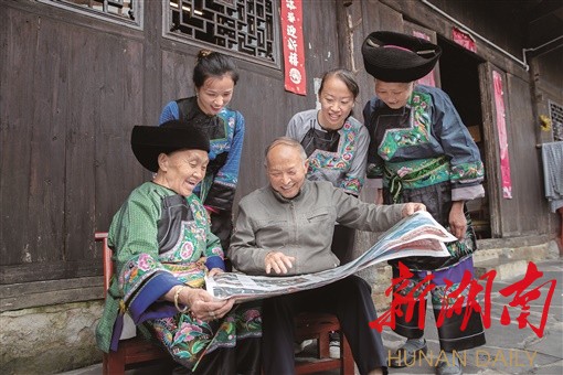 (9月20日,花垣县十八洞村梨子寨,村民们在阅读《湖南日报》刊登的习近平总书记在湖南考察的新闻,认真学习、领会习近平总书记的讲话精神。 石林荣 摄)