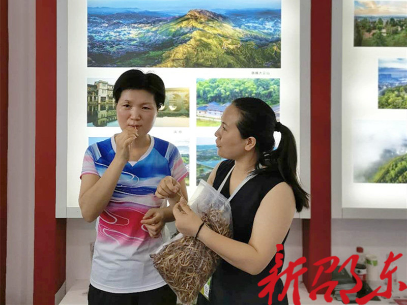 李喜圆(右)在湖南省旅游博览会上推介永华村的黄花菜