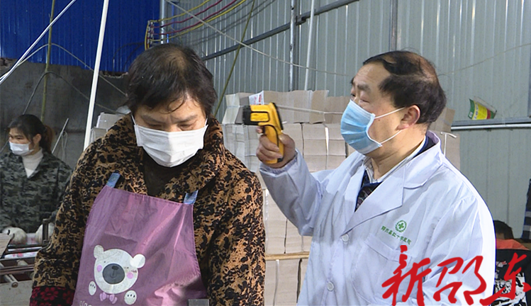 在湖南省肆成门业有限公司的厂房内,曾良华正在为员工逐一测量体温,检查口罩佩戴情况。曾良华是湖南省珊星粘胶制品有限公司、湖南省肆成门业有限公司、邵东水泵制造公司的驻厂医生。每天,他都要为这三个企业的员工测量两次体温,并指导员工在生产中做好自身防护措施。