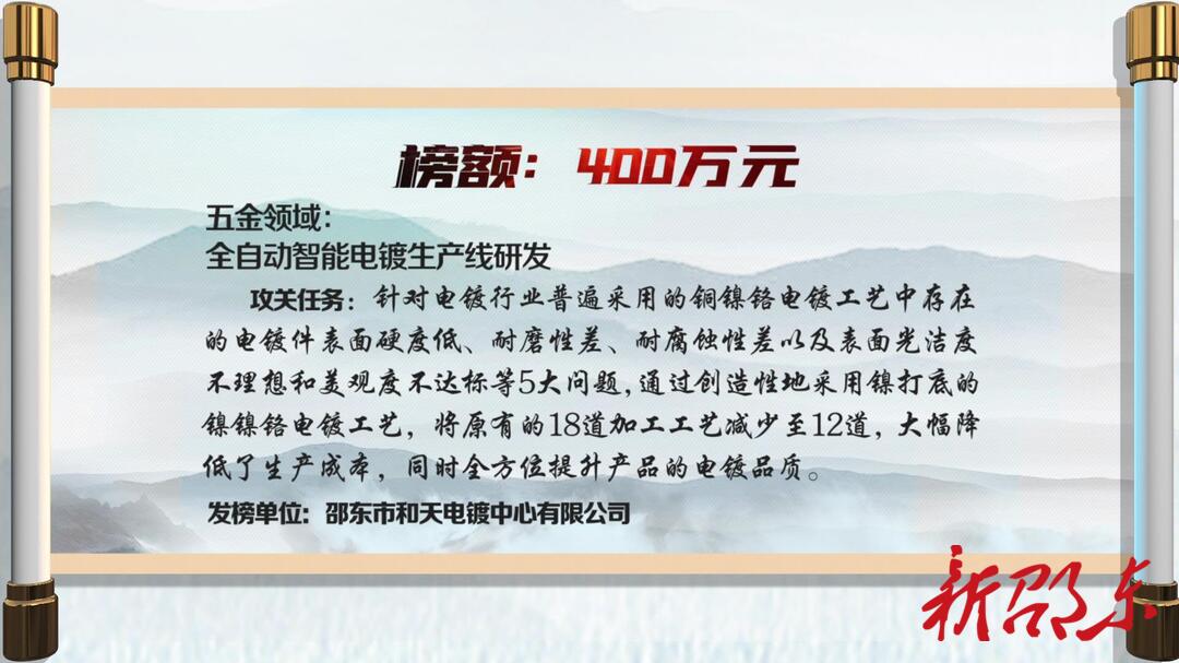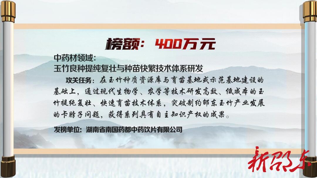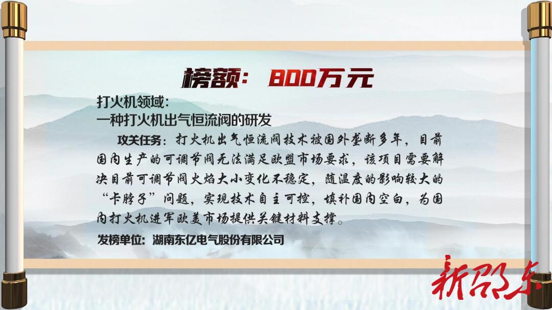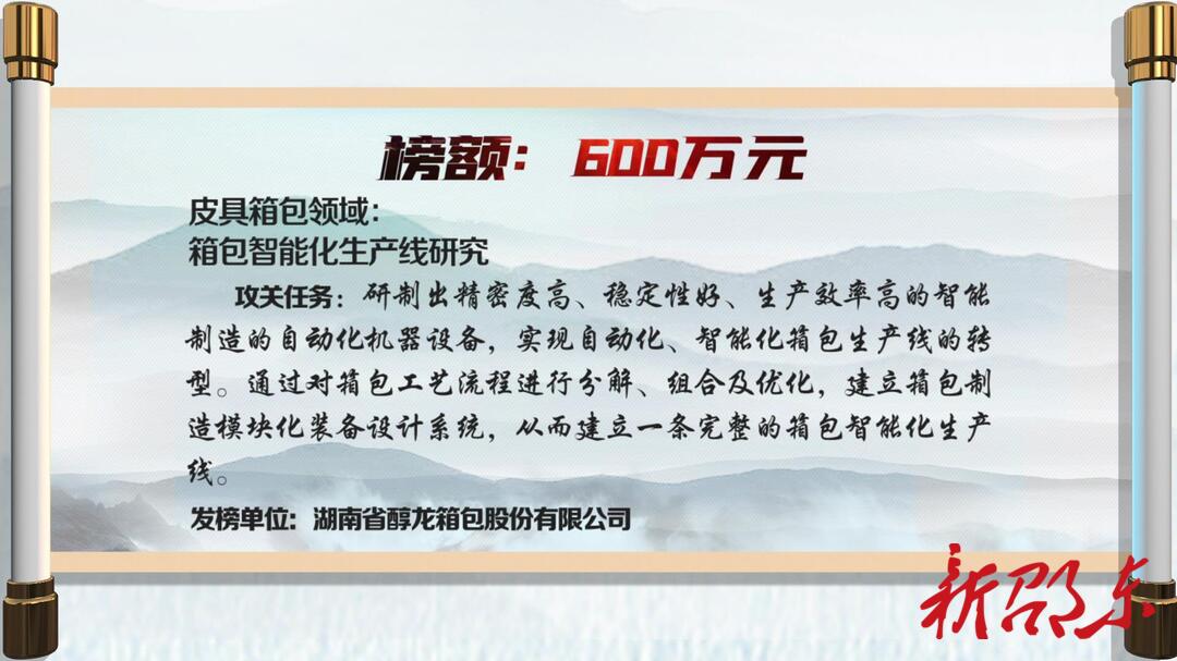 本次新闻发布会共发布了4个“揭榜挂帅”项目,覆盖邵东五金、中医药、打火机、皮具箱包四大产业链中的4家重点企业,主要包括玉竹良种提纯复壮与种苗快繁技术体系研发、箱包智能化生产线研究、一种打火机出气恒流阀的研发、全自动智能电镀生产线等技术需求难题。揭榜单位须为国内外高校、科研院所、新型研发机构等独立法人单位,鼓励企业牵头、联合行业上下游产学研科研力量组建创新联合体揭榜,要求在“揭榜挂帅”项目所属技术领域有良好的研究基础,具备完成任务所需的人才团队、科研场地、科研设备等条件。