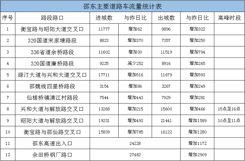 春运期间,邵东市各主要道路车流量大幅增加,交通拥堵时有发生,为方便驾驶员出行,邵东交警每天对辖区主要道路路口的车流量进行统计并公布(统计时间段:先天下午5点至当天下午5点),请广大驾驶员出行时提前做好规划,尽量避开交通高峰时段和路段,确保交通安全顺畅。