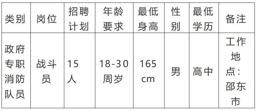 为有效履行防范化解重大安全风险、应对处置各类灾害事故的职责使命,提升全市消防救援队伍应急救援能力,现邵东市消防救援大队面向社会公开招聘15名政府专职消防员,具体招聘方案公告如下: