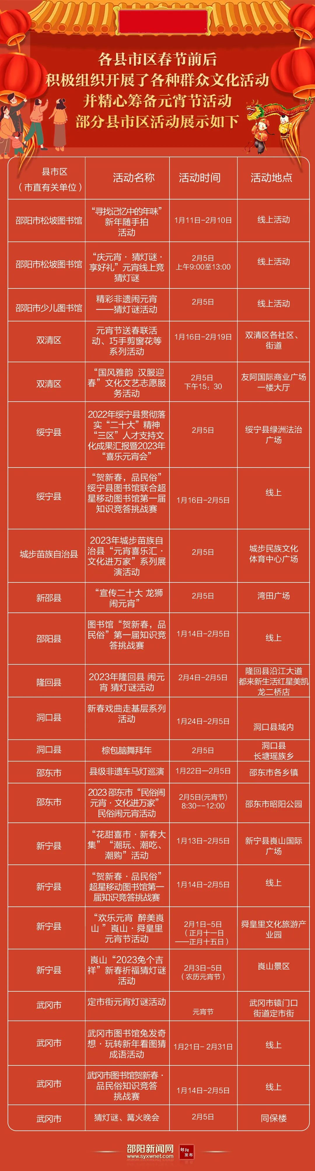 喜乐闹元宵 幸福新邵阳 (农历正月十五) 上午9:00—12:00 主会场: 市文化艺术中心爱莲文化广场 分会场: 市少儿图书馆(红旗路264号) 县市区分会场: 互动体验 1.书法家、美术家现场作画、写字,送元宵祝福; 2.体验滩头木版年画印制、剪纸工艺; 3.书香邵阳全民阅读送湘书活动; 4.全家福打卡; 5.免费元宵、邵阳特色小吃体验。