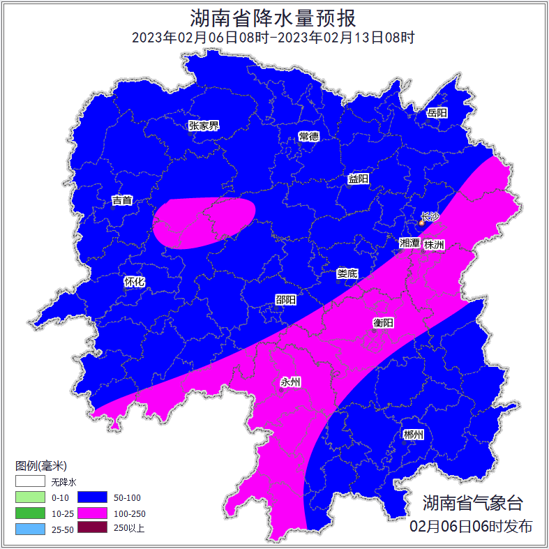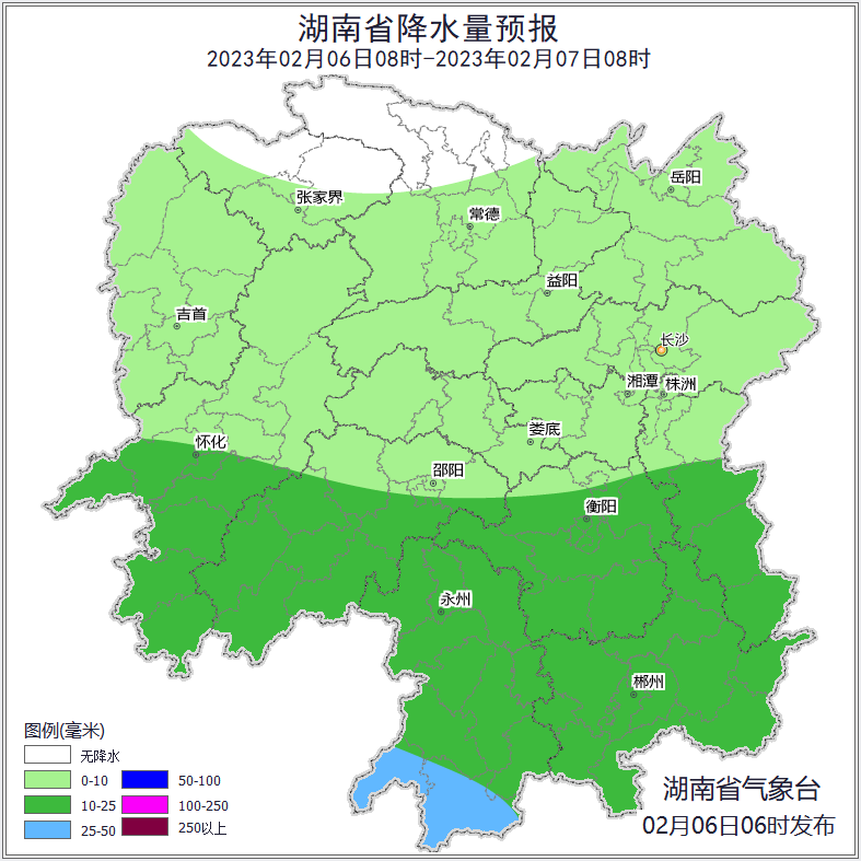 6日,张家界北部、常德北部阴天间多云,其他地区阴天有小到中雨,其中永州南部局地大雨;北风2~3级;最高气温湘北9~11℃,其他地区7~9℃;最低气温5~7℃。