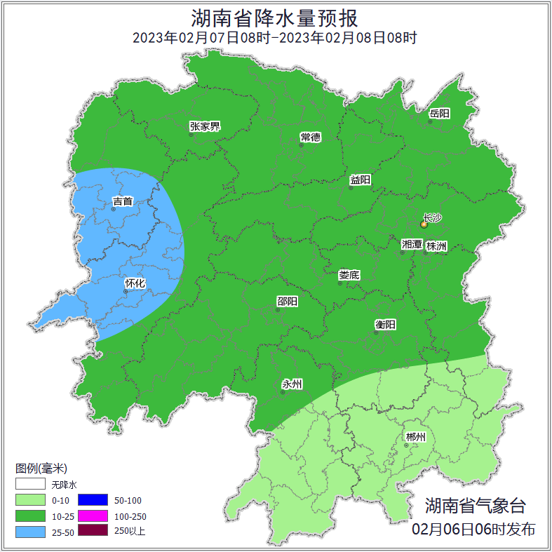 7日,衡阳南部、永州南部、郴州、株洲南部阴天有小雨,其他地区阴天有中雨,其中湘西州南部、怀化中北部局地大雨;北风2~3级;最高气温10~12℃;最低气温6~8℃。