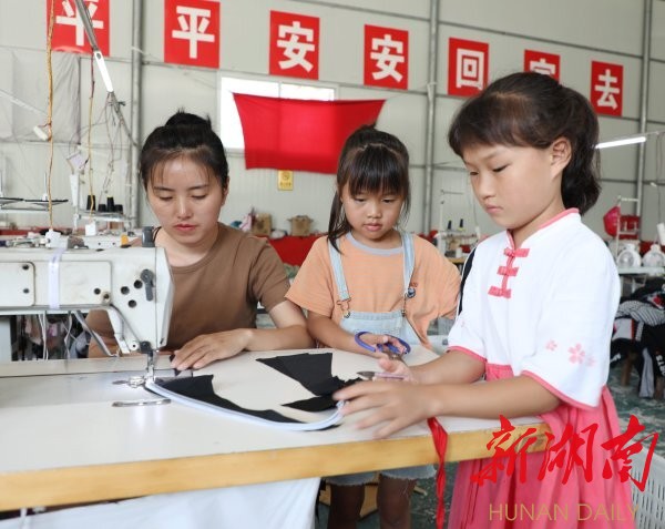 (△8月27日,保靖县毛沟镇拱桥村扶贫车间,一留守妇女带着孩子在工作。近年,该县积极拓宽农村留守妇女就业创业渠道,通过开展就业技能培训,让农村留守妇女在家门口稳定就业增收。俞采华 陈亚平 摄影报道)