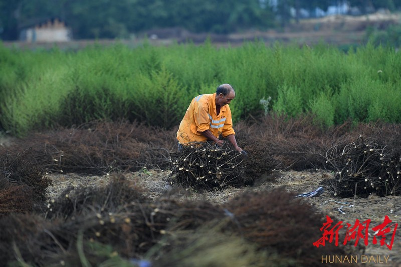 (8月19日6时许,冷水滩区黄阳司镇水口桥村,屈冬春将晒好的青蒿打包,准备挑回家。为了避免日晒,防止晒干的青蒿掉叶,村民大多选择凌晨3时至6时收割青蒿。 湖南日报·新湖南客户端记者 傅聪 摄)