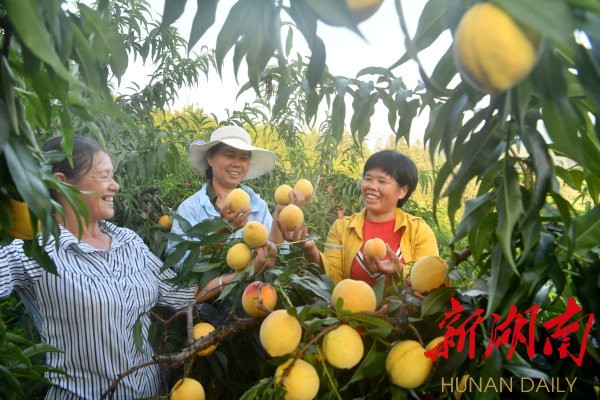 (8月5日清晨,洪江市黔城镇桃源村锦绣黄桃基地,黄桃挂满枝头,种桃大户詹训瑶(右)和村民一起开心地采摘。湖南日报首席记者 郭立亮 摄)