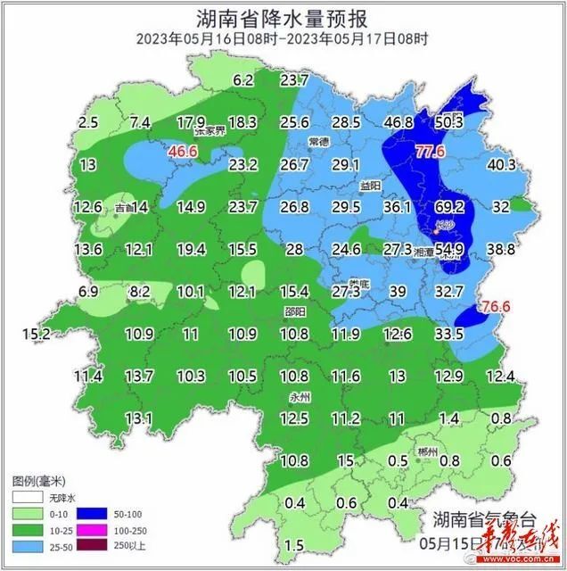 5月15日,湖南省气象台发布最新气象信息,预计未来一周(5月15日至21日)省内有两次降雨过程,并伴有短时强降水、雷暴大风等强对流天气。16日至17日白天,受低涡切变影响,省内有一次大到暴雨过程,其中16日益阳、岳阳、长沙、株洲局地暴雨,17日白天降雨南压,湘南局地大雨。20日开始,受高空波动、低层切变及较强冷空气影响,省内还有一次暴雨到大暴雨过程,其中20日湘中局地有暴雨,21日湘中、湘北部分地区有暴雨,局地大暴雨。其他时段以晴天间多云天气为主,其中15日晚湘西、19日晚湘中湘南多云转阵雨或雷阵雨。另外,18日、19日早晨湘中、湘北部分地区有雾。