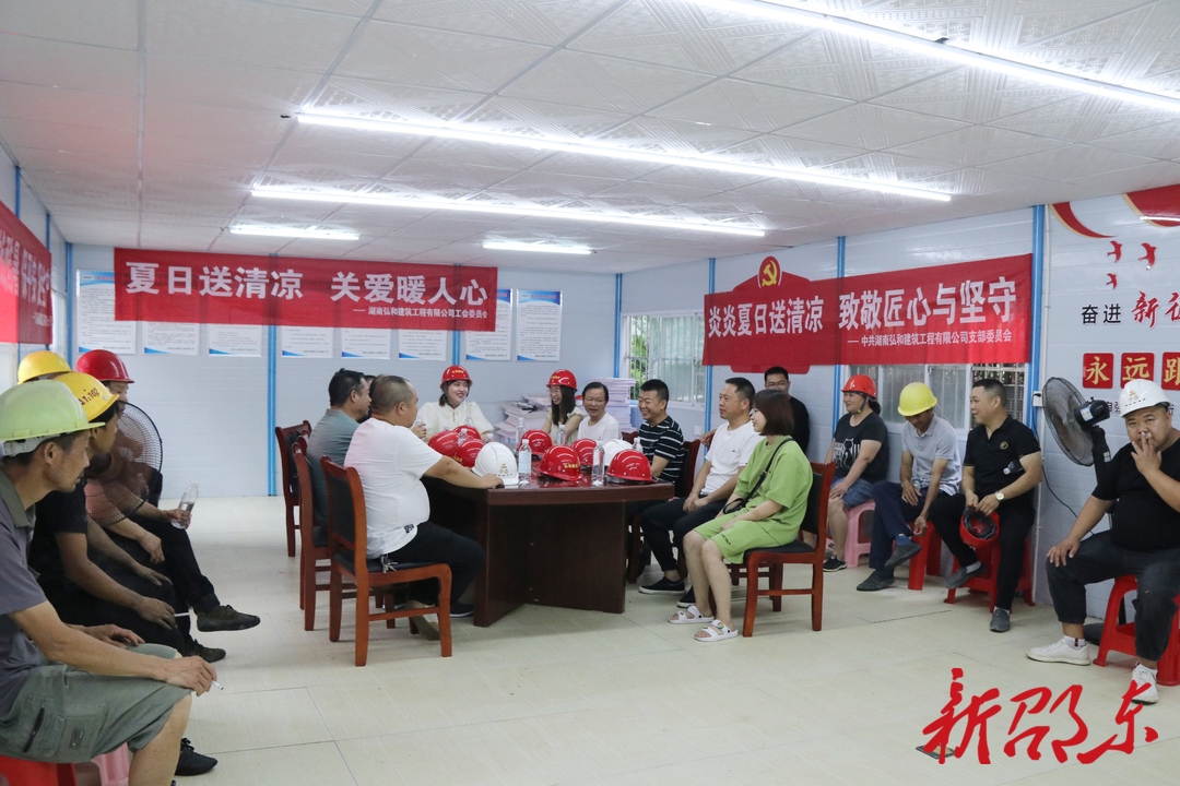 新邵东客户端6月21日讯(记者 刘意忠)6月21日,湖南弘和建筑工程有限公司党支部、工会来到在建工程项目工地,开展“夏季送清凉”慰问暨“安全生产月”宣传活动,致敬每一份匠心和坚守。