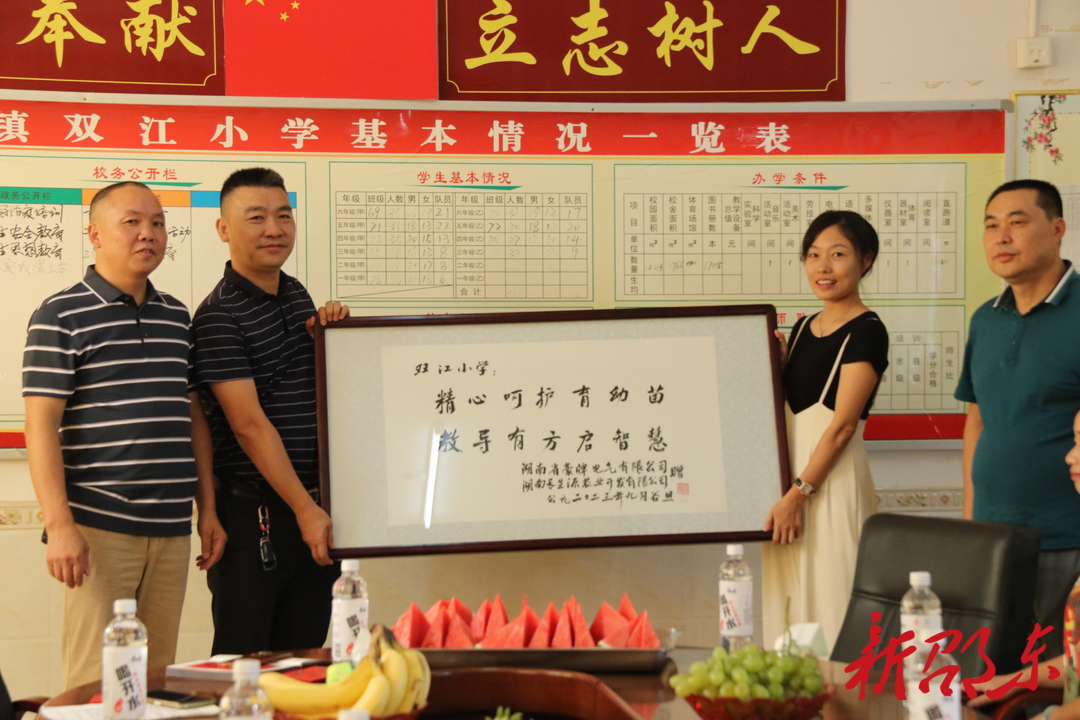 在教师节来临之际,双江村乡贤、湖南省豪牌电气有限公司董事长刘汉豪,湖南省长生源农业开发有限公司董事长刘立夫,两市塘街道城南小学校长刘雨春一行来到双江小学,了解学校建设情况,分析教育发展思路,向辛苦奋斗在一线的教师致以节日的问候。乡贤代表刘汉豪动情地说:“支持家乡教育事业的发展,是每一个双江人的责任,豪牌电气今后将一如既往地为家乡的教育事业、为家乡的振兴发展,尽一份绵薄之力。”