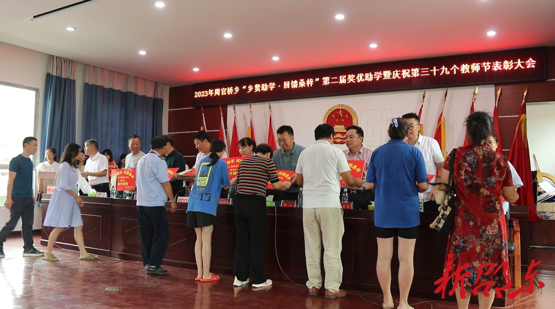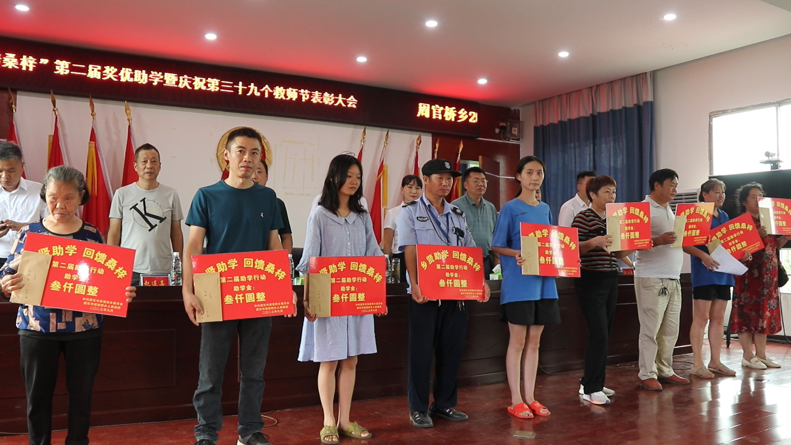 会议宣读了《周官桥乡关于表彰高考优秀学生、励志学生、优秀教师、教育教学先进集体及教育质量先进个人的决定》,现场为31名困难励志学生颁发助学金,为8名考取985、211学校的高考优秀学生颁发奖学金,为16名优秀教师代表颁发奖教金,共计12万余元,同时给予周官桥乡中心学校5万元奖教金和3万元教师节慰问金。
