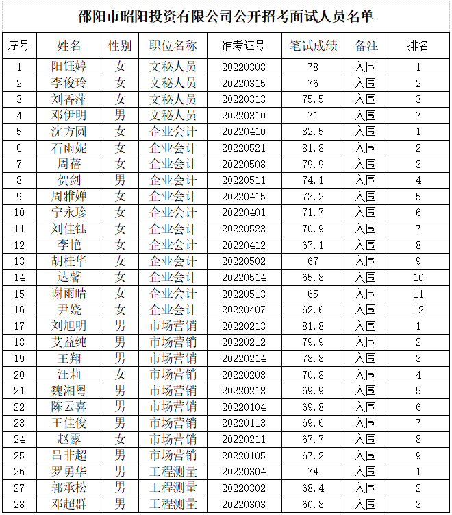根据《邵阳市昭阳投资发展有限公司公开招聘工作人员公告》,经过资格审查、笔试考核,按岗位招聘数1∶3的比例确定入围面试人员,如面试人数未达到1∶3的比例时,则面试成绩不得低于65分,方能录取。现将入围面试人员名单公布如下: