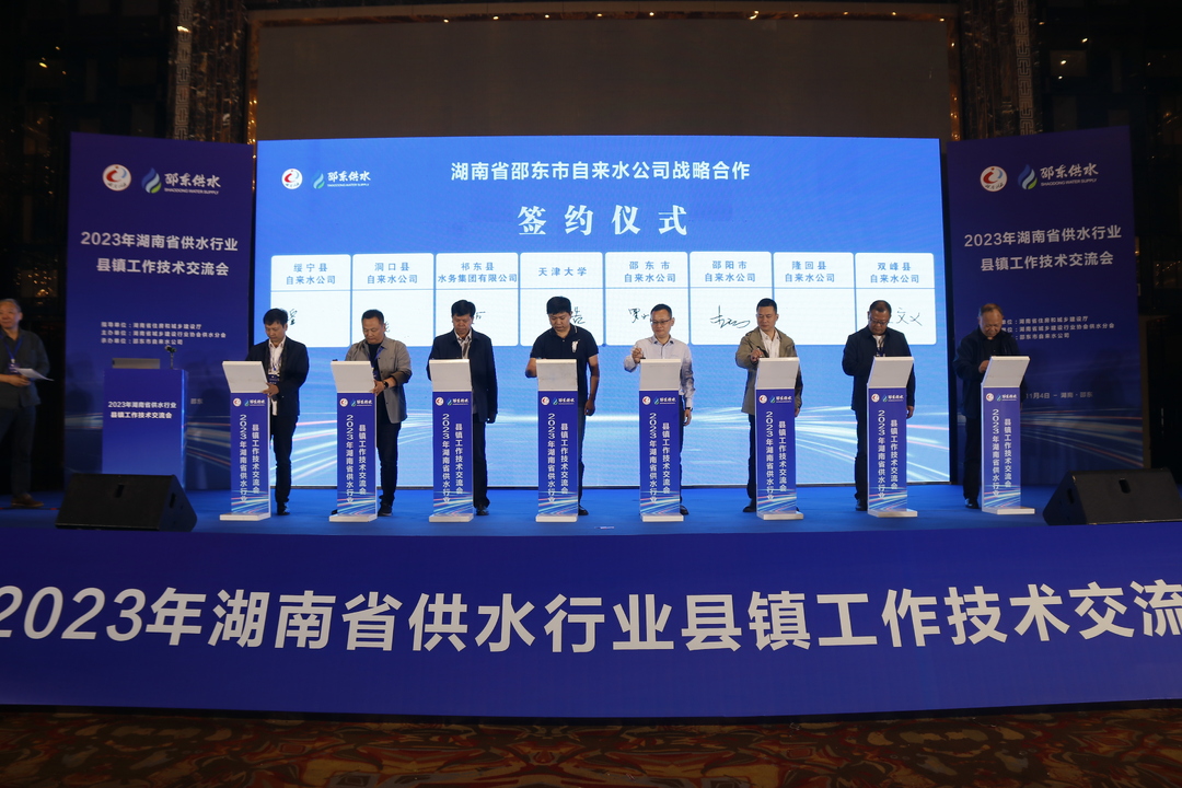 会议还举行了战略合作签约仪式,邵东水司和天津大学、邵阳市水司、祁东水务、隆回水司、洞口水司、绥宁水司、双峰水司进行战略合作签约,将共同在管道机器人探漏、管道气水脉冲清洗、漏损控制、水厂改造等方面开展合作。