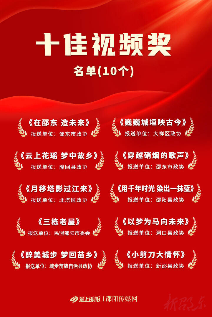 新邵东客户端12月20日讯(通讯员 刘昭云)12月19日,2023年度邵阳市“委员说邵阳”短视频大赛比赛结果揭晓,共有二十件作品获奖,其中,由邵东市政协报送的4件作品均获奖,荣膺比赛“大满贯”,《在邵东 造未来》《穿越硝烟的歌声》荣获“十佳视频奖”,《那些岁月 那座桥》获“最佳文案奖”,《家乡的豆腐》获“最佳人气奖”。邵东市政协荣获“十佳组织奖”。