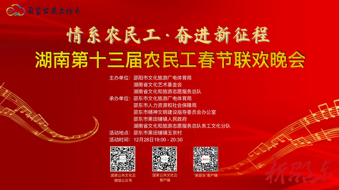 为进一步丰富农民工的精神文化生活,推动基层群众文化建设大众化、健康、持续、有序发展,助推乡村振兴发展战略。12月28日19:00,“情系农民工·奋进新征程”湖南第十三届农民工春节联欢晚会将在邵东市黑田铺镇玉京村举行。届时,邵东市融媒体中心“新邵东”客户端将进行全程直播,同时,国家公共文化云等平台也将进行同步直播。