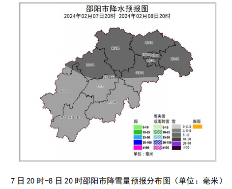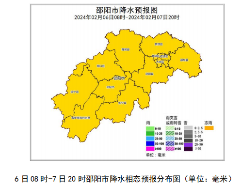 3.邵阳市前期降水偏多,6日至8日的雨雪冰冻可能会诱发山体滑坡、塌方等地质灾害,需注意防范。