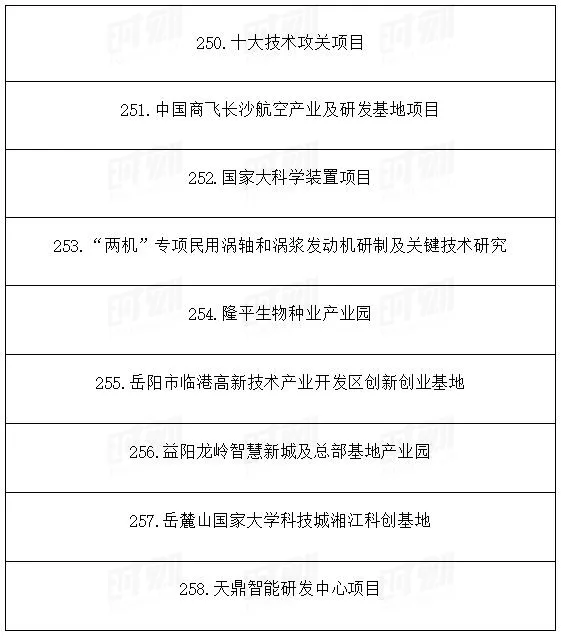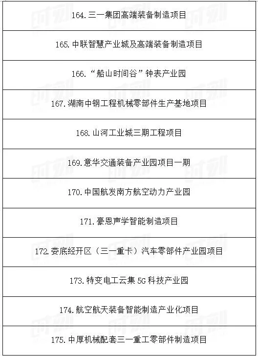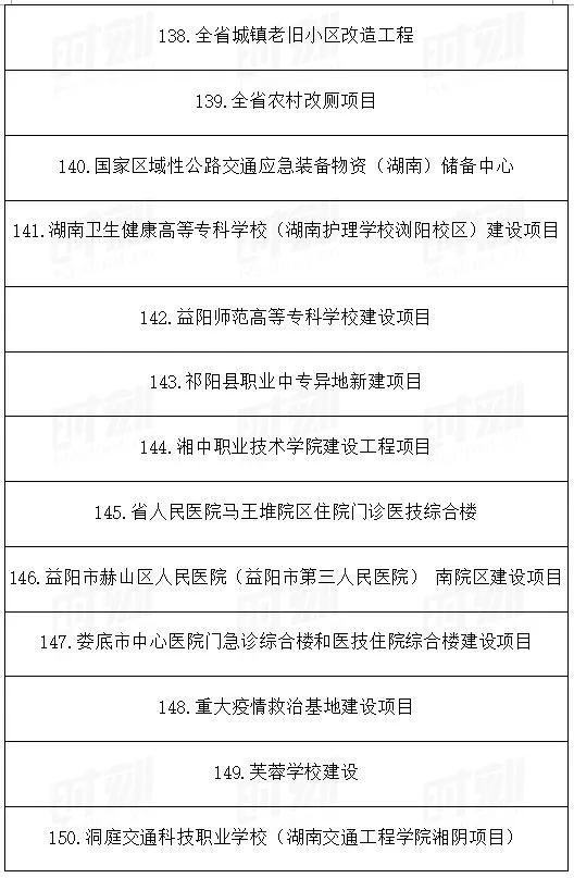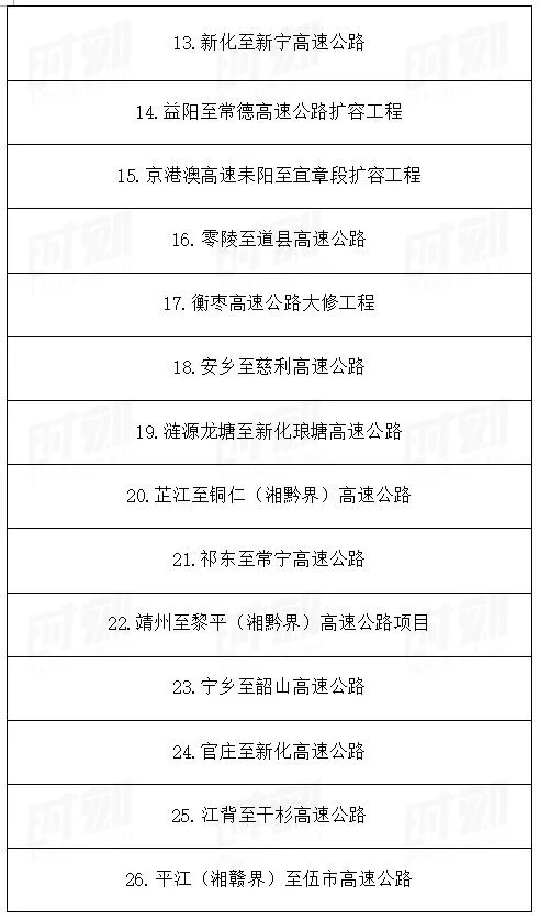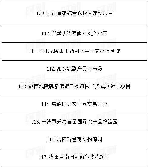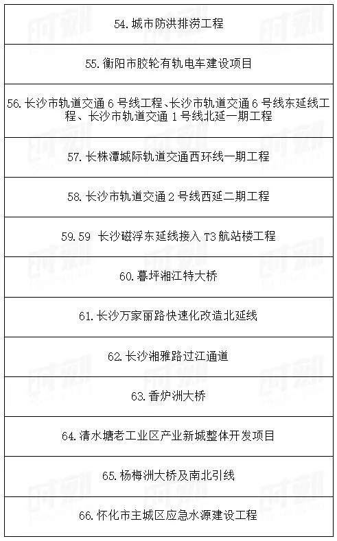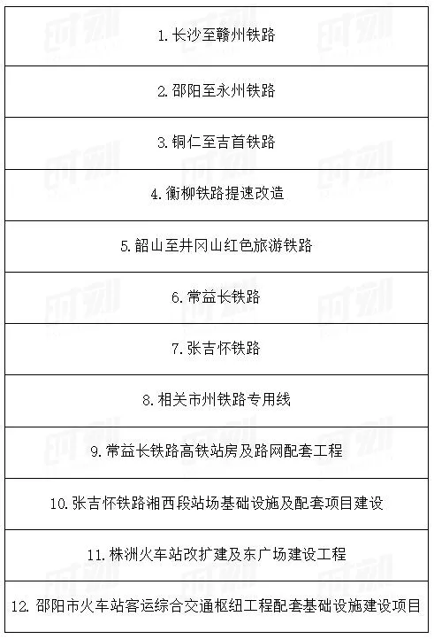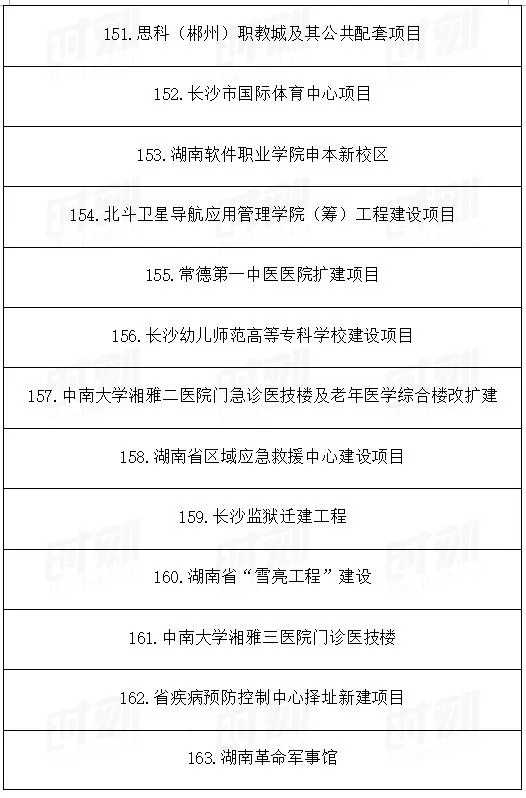 其中,今年新开工项目100个,包括长赣铁路、华菱汽车板二期、益阳至常德高速公路扩容、中国商飞长沙航空产业及研发基地项目等;续建201个,包括常益长铁路、马栏山视频文创产业园、蓝思电子信息、三安半导体、芙蓉学校等。301个省重点建设项目名单一基础设施(119个)